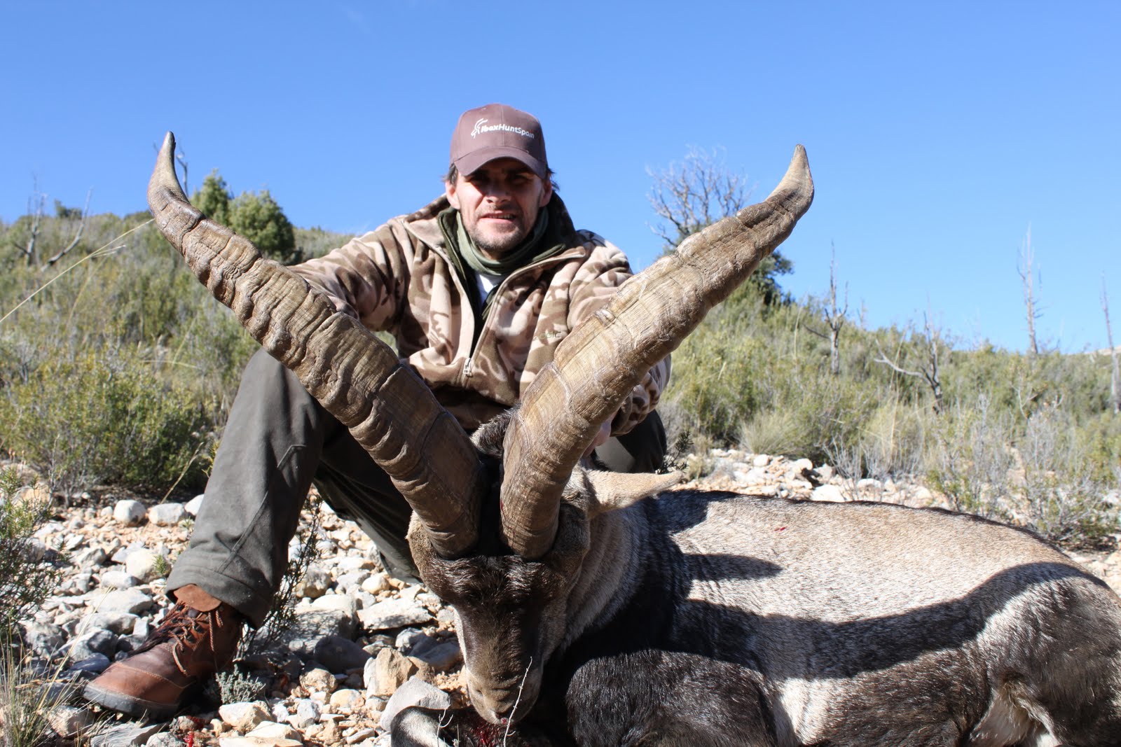 vi startet med å oppservere 3 stk ibex hvor en var skytbar. og så var det i gang. Det første var å klatre opover i fjellsiden for å vinne høyde på dyra. vi måtte helt opp på fjellryggen for å kunne bruke den som dekning når vi beveget oss mot dyra, eller rettere sakt hang etter. det ble en 3 timers fantastisk smygjakt, hvor vi var nære på et par ganger men hvor de kom seg unna. vi så dem om trent hele tiden under disse tre timene, men skyteavstanden var for stor. 3-400 meter. etter 2,5t så la de seg ned for å hvile. vi benyttet da muligheten til å komme innpå ved å gå rundt de for så å smyge inn fra en annen side. vi kom da inn på ca 230m. da hadde vi en dal i mellom oss. og dyrene lå fremdeles. her ble vi liggende å vente på skuddsjangsen til de reiste seg. en halv time på magen med en stor ibex i kikkerten er en påkjening, det bør prøves.